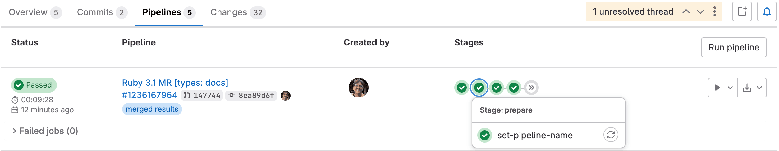 Select a pipeline to open the pipeline details page which shows every job in the pipeline. From this page you can cancel a running pipeline, retry failed jobs, or delete a pipeline.