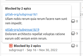 - Introduced in GitLab 15.5: View blocking epics when hovering over the "blocked" icon.