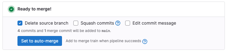 you can select Set to auto-merge. The merge request auto-merges when all required checks complete successfully, and you don't need to remember to manually merge the merge request.