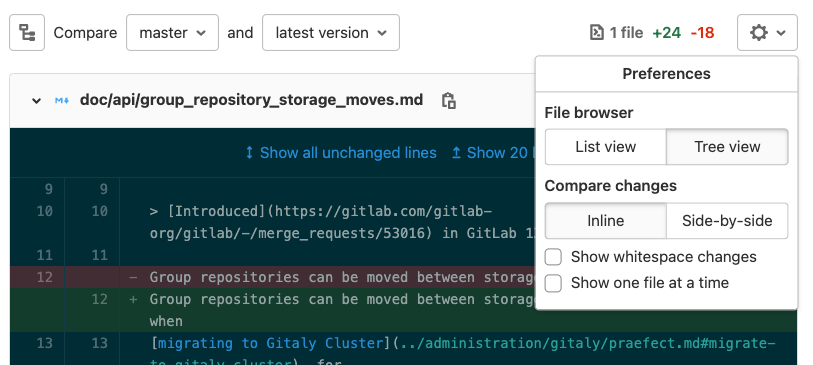 For larger merge requests, you can review one file at a time. You can change this setting in your user preferences, or when you review a merge request. If you change this setting in a merge request, it updates your user settings as well.